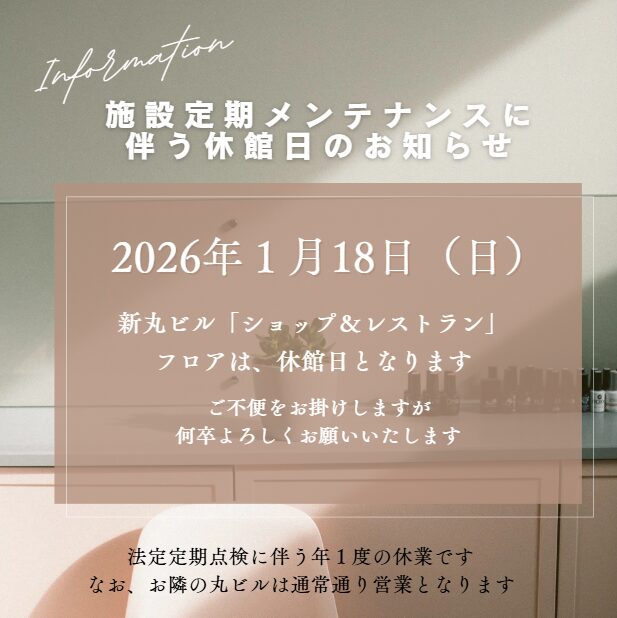 法定点検のため、新丸ビルは2026年1月18日(日)はショップ&レストラン全館休館とさせていただきます。