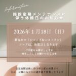2025年10月27日 / 最終更新日 : 2025年10月27日 MCSホームページ担当者(YY)MCSホームページ担当者(YY) 新丸ビル店ブログ 【新丸ビル】1/18(日) 法定設備点検に伴う「ショップ&レストラン」全館休業日のお知らせ MCS新丸ビル店のブログをご覧の皆様こんにちは。 いつもMCS新丸ビル店をご利用頂き、ありがとうございます。 法定点検のため、新丸ビルは2026年1月18日(日)はショップ&レストラン全館休館とさせていただきます。 お客 […]