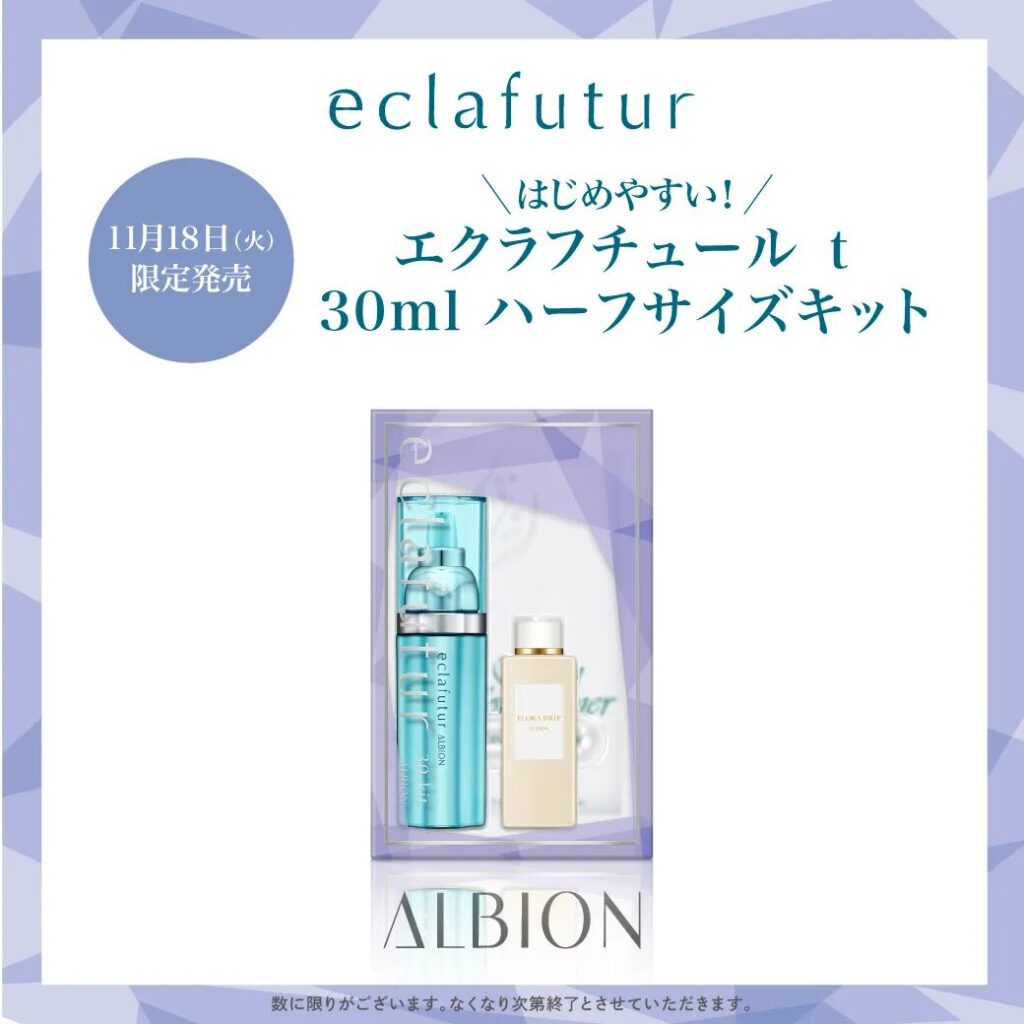| 30 ml キット | 8,250円 | ・エクラフチュール t〈美容液〉30 ml(本体) ・フローラドリップ s〈化粧液〉24 ml ・薬用スキンコンディショナー エッセンシャル ペーパーマスク N(14 ml×1枚)〈医薬部外品〉 |