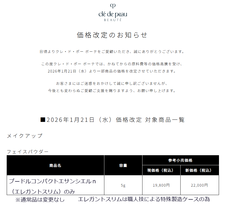 【お知らせ】クレ・ド・ポー ボーテ 一部商品の価格改定について(2026年1月21日より)
